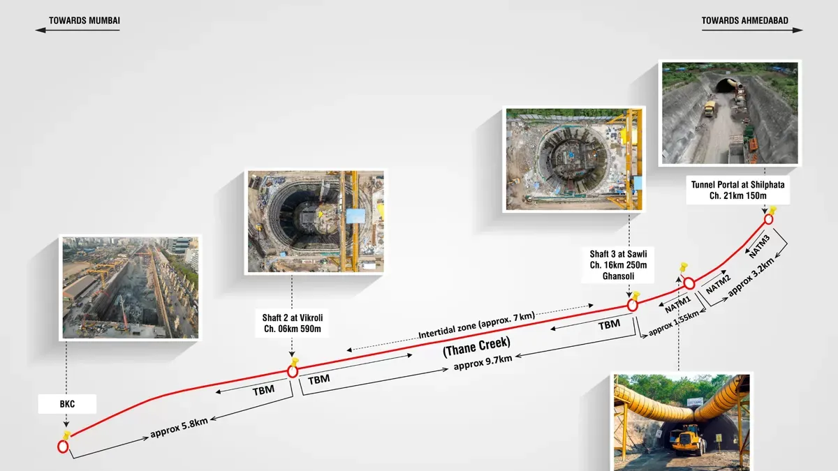 Out of the total tunnel length, 5 kilometres is being constructed using the New Austrian Tunnelling Method (NATM) between Shilphata and Ghansoli, while the remaining 16 kilometres will be executed with Tunnel Boring Machines (TBMs). The tunnel also features a 7-kilometre undersea stretch beneath Tha..